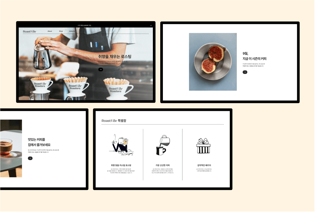 커피 한 잔이면 어제보다 더 나은 하루가 될 수 있다고 믿는 로스터리 브랜드 로스트 바이브를 위해 콘텐츠 전략, 홈페이지 메인 페이지 디자인을 진행했습니다. 로스트 바이브는 커피를 사랑하는 바리스타들이 만드는 로스터리 브랜드로 커피의 전문성과 맛을 알리는 것을 목표로 삼았습니다.