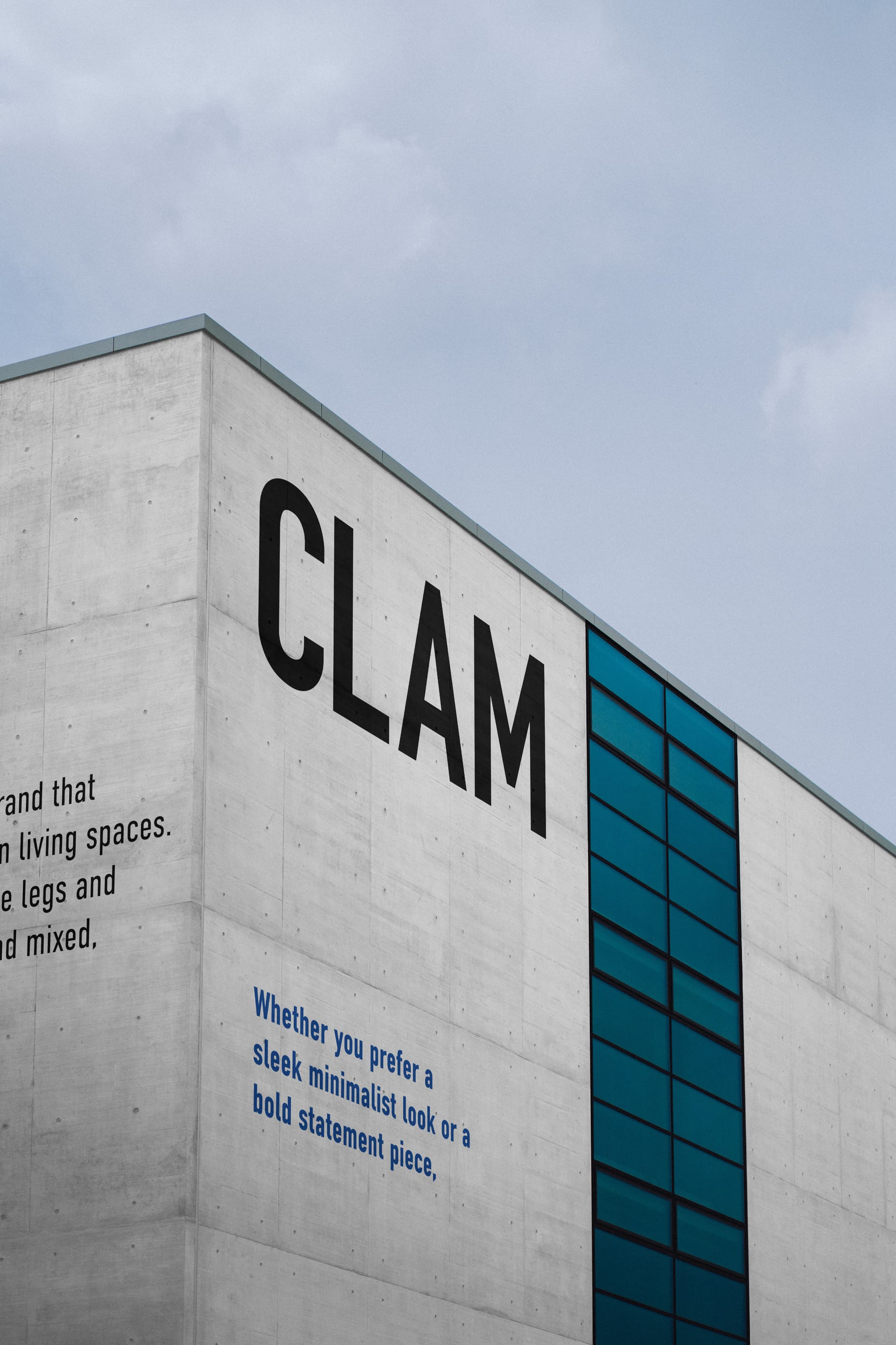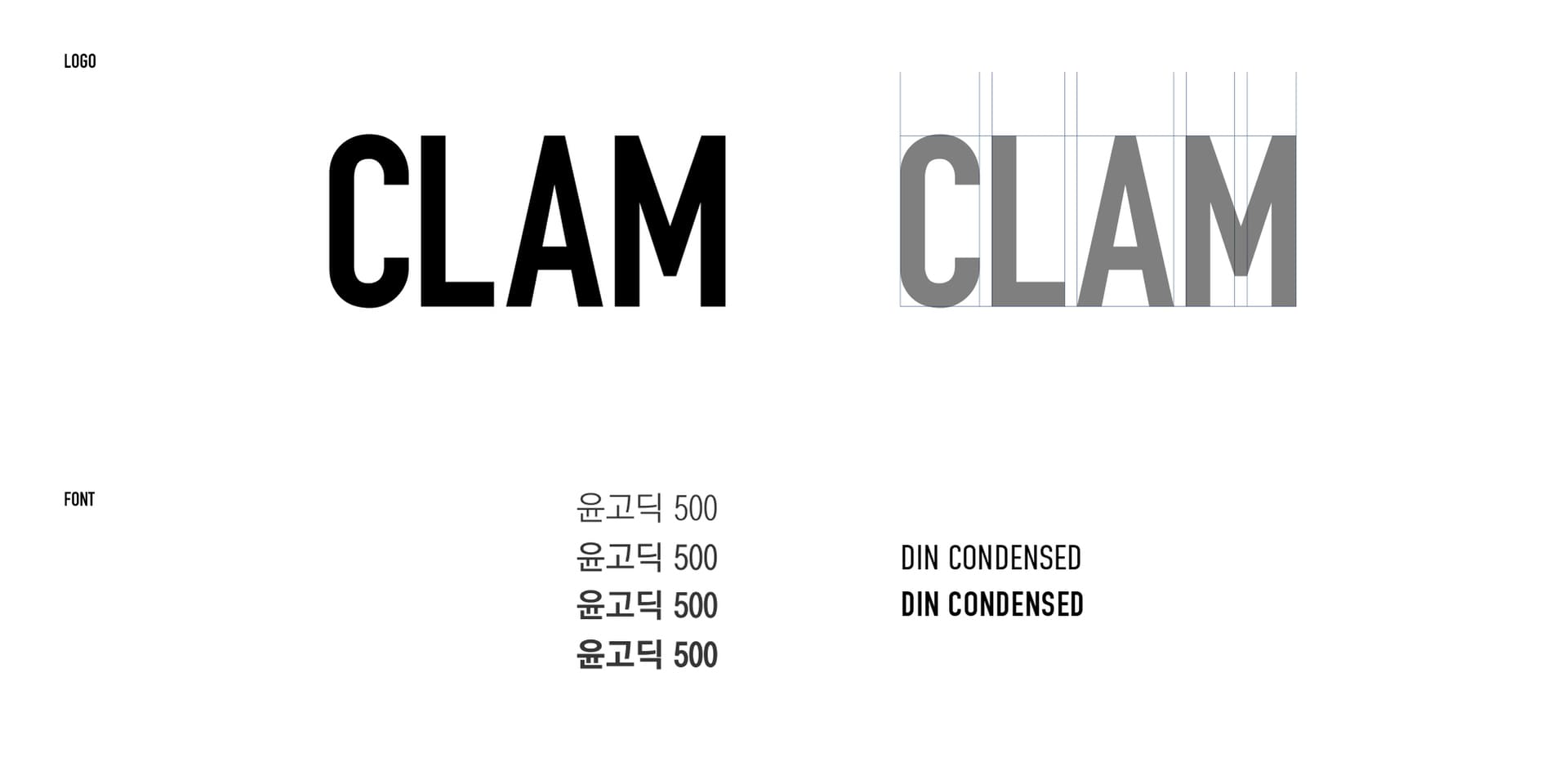 CLAM의 브랜드 아이덴티티 구축 과정에서 가장 중요한 과제는 제품의 독특한 특성을 시각적으로 표현하는 것이었습니다. 레그 제품의 길쭉하고 견고한 물리적 특성에서 영감을 받아, 우리는 DIN 폰트를 메인 타이포그래피로 선정했습니다. DIN의 균일한 글자 폭과 수직적 특성은 CLAM 레그의 구조적 강점을 효과적으로 반영합니다.