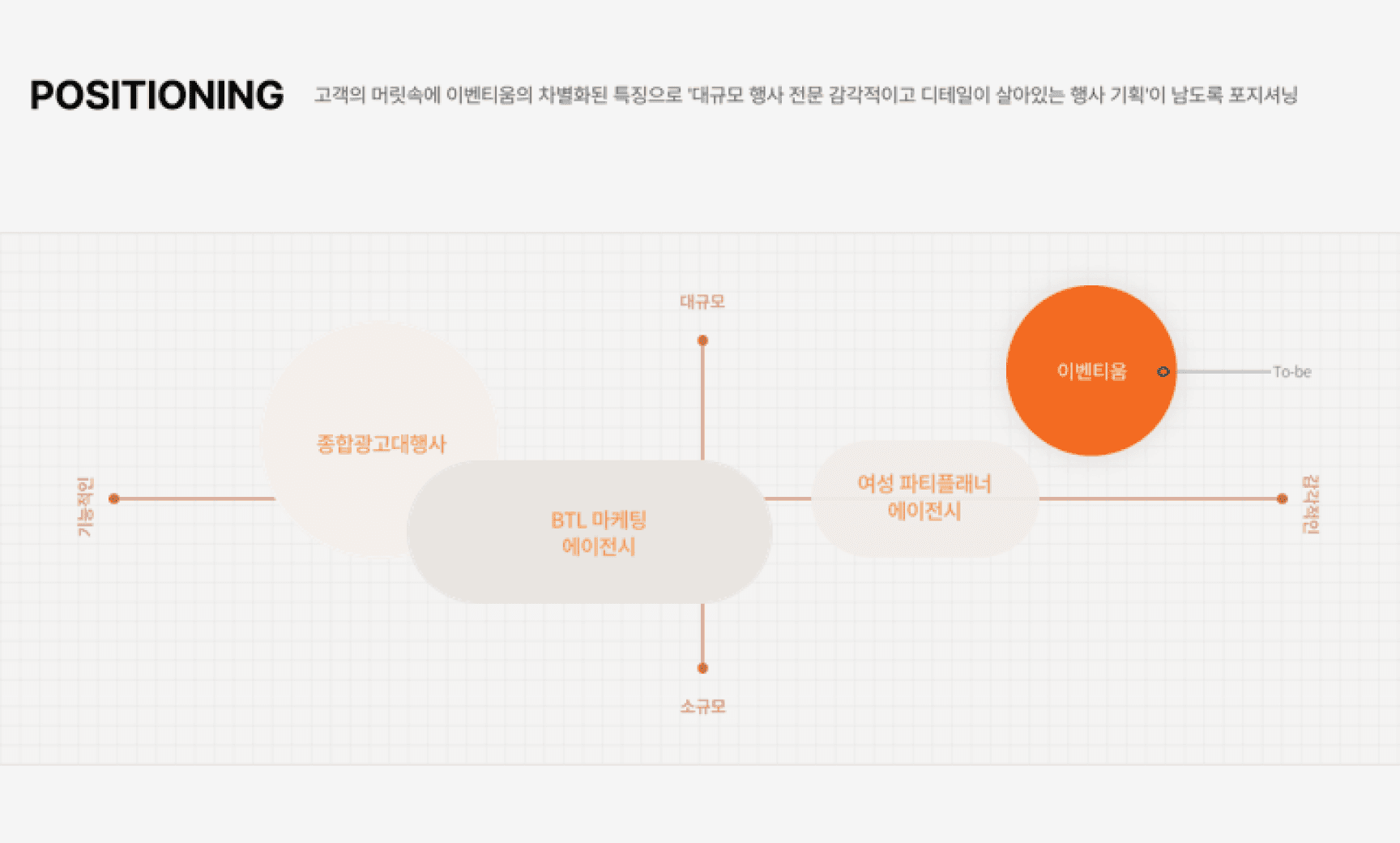 브랜드 포지셔닝: 경쟁사와 차별화되는 브랜드의 고유한 위치를 설정합니다. 이는 타겟 고객의 마음속에 브랜드가 어떤 위치를 차지하기를 원하는지를 명확히 하는 과정입니다. 이 때, 브랜드의 비전에 따라 경쟁사를 어떻게 규정할 지 달라질 수 있습니다.